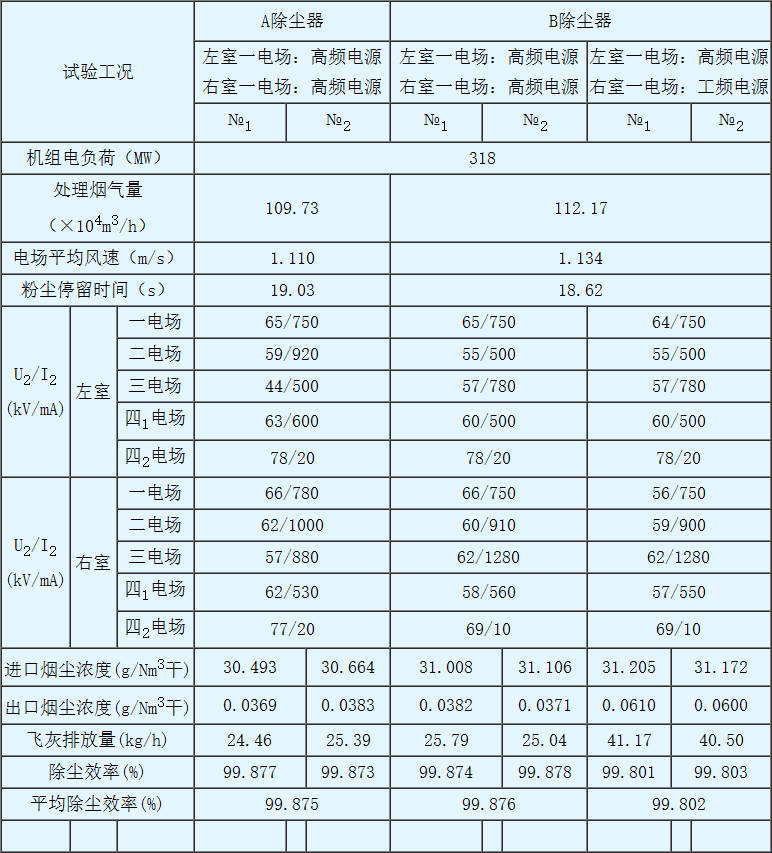 该项目改造完毕后,于2008年3月由河南电力试验研究院进行电除尘器效率测试,其中B除尘器右室一电场分别采用高频电源(0.8A/72kV)和工频电源(0.8A/72kV)进行对比测试,试验数据及计算结果见表3: