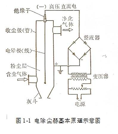 电除尘器是在两个曲率半径相差较大的金属阳极和阴极上,通过高压直流电,维持一个足以使气体电离的静电场。气体电离后所生成的电子,阴离子和阳离子,吸附在通过电场的粉尘上,而使粉尘获得电荷。荷电粉尘在电场力的作用下,便向电极性相反的电极运行而沉积在电极上,可达到粉尘和气体分离的目的。如图所示:
